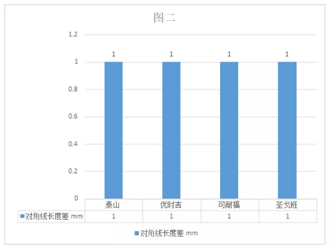 从外观质量和尺寸偏差检测来看,四个品牌均符合国标要求。如图一所示,在长度与宽度偏差中,可耐福偏差最大,长度与宽度均为-2mm,圣戈班于泰山的宽度偏差也为-2mm,泰山的长度偏差为0mm。值得一提的是,四家重点品牌的产品厚度偏差中,除圣戈班为-0.1mm外,其余均为正偏差(+0.1mm至+0.3mm)。在上一年度检测解读中,我们提到厚板将成为行业发展趋势。从综合对比上一年长三角地区的检测数据来看,重点品牌都在为厚板做准备。以泰山为例,泰山的厚度偏差为+0.3mm,在国标的要求的基础上,泰山产品的厚度已经接近10mm,泰山占据中国纸面石膏板50%左右的市场份额,同时在长三角这个市场风向标地区展示如此数据,无异于进一步确认了纸面石膏板“厚板化”这一趋势。