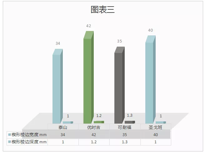 纸面石膏板行业虽然集中度较高,但各企业之间的生产标准与工艺水平参差不齐,即便是同种类型的产品,技术指标与参数也会存在细微的差异。如何界定“一线重点品牌的纸面石膏板”,关键在于企业生产产品时的标准化程度。“对角线长度差、楔形棱边宽度与深度”,是能直观反应石膏板生产企业标准化生产能力的指标。从图二、图三中可以看出,四个品牌都在国标范围之内,在图二的对角线长度差的对比中,四个品牌的数据一致。对角线长度差所表现的是石膏板的平直度,这一数据在施工中表现尤为重要。差值过高在隔墙或吊顶中影响墙面或吊顶的整体平直度,需要更多的人工来修正。