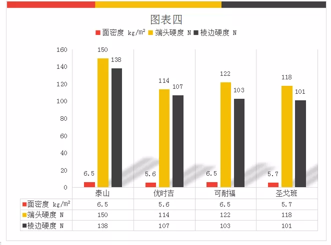 图四分别显示了四个品牌石膏板的面密度与硬度(端头、棱边)的对比数值。值得一注意的是,泰山与可耐福在四个品牌中面密度达到了6.5kg/m2,但所表现出来的硬度数值却截然不同。泰山端头与棱边的硬度分别为150N和138N,可耐福端头与棱边分别为122N和103N。常理来讲面密度越大,纸面石膏板的硬度越高。这不同于泰山一直以来的稳定的数值,也不同于采用硬边技术的优时吉和圣戈班的数据。