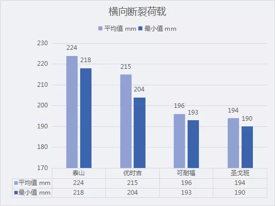 作为非承重内隔墙和吊顶的重要装饰材料,纸面石膏板在该区域的市场需求将大量涌现,因此断裂荷载是否达标极为重要。图五、图六中分别展示了纵向与横向断裂荷载的对比数值,四个品牌都在国标范围之内,纵向断裂荷载中四个品牌的数值较为平均,以泰山为最高。在横向断裂荷载数值中,泰山的数值仍为四个品牌中最高,可耐福与圣戈班的平均值与最小值则均低于200N。