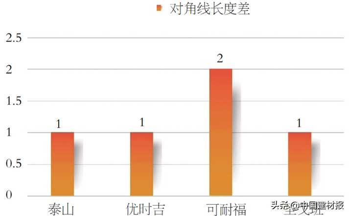 从图一中可以看出,四个品牌都在国标范围之内,泰山、优时吉、圣戈班对角线长度差为1mm,可耐福数值最高为2mm。对角线长度差代表了石膏板的直角偏离度,差值过高在隔墙或吊顶中影响墙面的整体平直度,需要后续人工修正。
